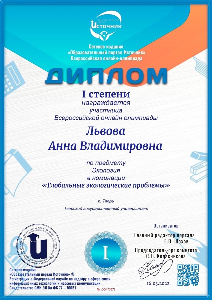 С.А. Матвеева, В.Ю. Смирнова, М.М. Новосёлова и А.В. Львова были отмечены дипломами 1 степени по предмету «Экология» в номинациях «Экологическое право» и «Глобальные экологические проблемы». А.Т. Нуштаева, Е.Т. Кузьмина, Е.В. Иванова, Е.А. Кутилова, В.О. Лёвина, В.В. Кузнецова, Т.С. Козлова, А.А. Липатьева, А.Р. Ивантеева, М.В. Коненкова и А.Д. Кутузова показали очень высокие результаты выполнения задания, от 95 до 100%.