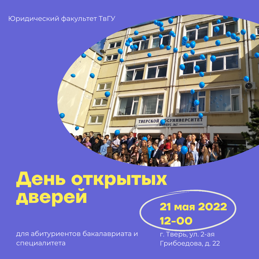 21 мая в 12:00 юридический факультет ТвГУ предлагает всем желающим посетить День открытых дверей, который состоится в учебном корпусе факультета по адресу: г. Тверь, ул. 2-ая Грибоедова, д. 22 (ауд. 315).