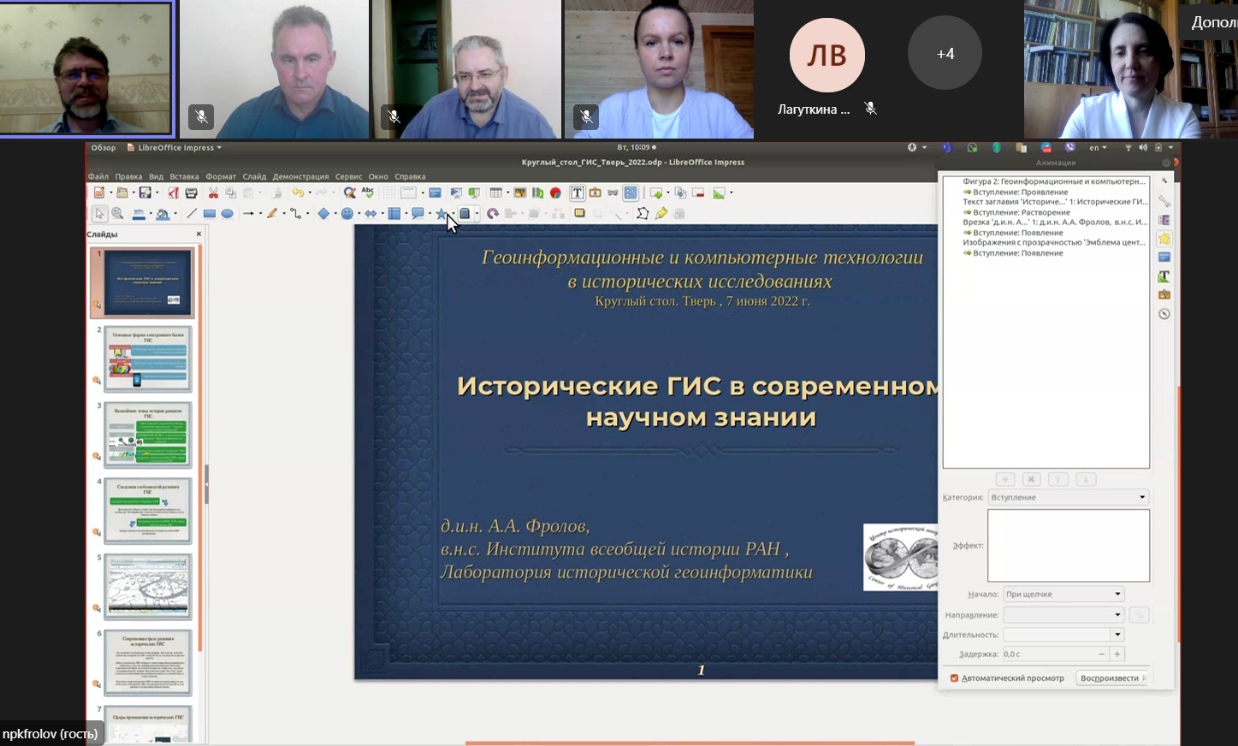 7 июня 2022 года состоялся круглый стол «Геоинформационные и 3D технологии в исторических исследованиях», организованный историческим факультетом Тверского государственного университета совместно с Лабораторией исторической геоинформатики Института всеобщей истории РАН и Межрегиональной ассоциацией «История и компьютер».