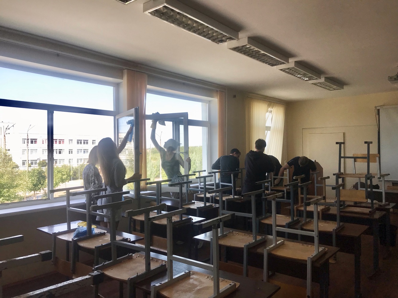 Ребята помыли окна, вытерли столы, стены, привели в порядок стулья. В перерыве студенты подкрепились пиццей и вкусным арбузом. Организаторы отмечают, что настроение у всех участников было бодрое, и никто из них не ленился.